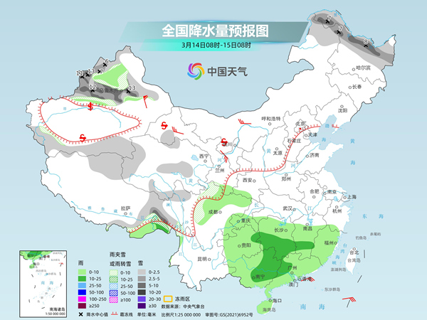 具體來看,今天,內(nèi)蒙古東北部、黑龍江北部、新疆北部和沿天山地區(qū)、西藏東部、青海西部、川西高原北部等地部分地區(qū)有小到中雪或雨夾雪,其中,黑龍江北部、新疆沿天山地區(qū)和伊犁河谷、西藏東南部等地部分地區(qū)有大到暴雪(10~13毫米)。西南地區(qū)東部、江南大部、華南等地部分地區(qū)有小到中雨。