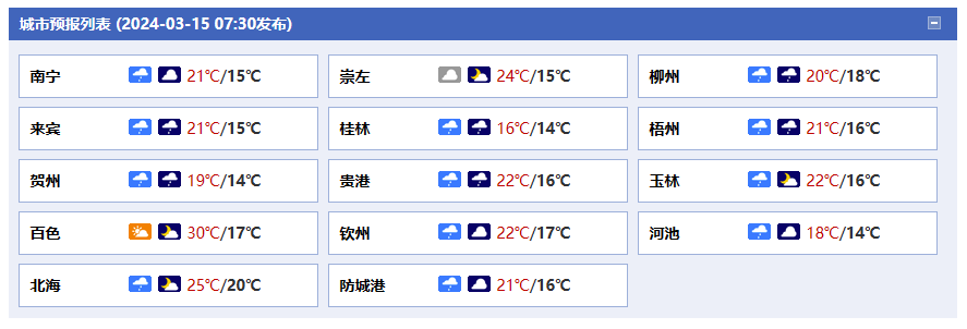 今天白天到晚上,桂林、柳州、賀州、來賓、梧州等市及河池市東部、南寧貴港兩市北部有小到中雨、局地大雨,我區(qū)其它地區(qū)陰天有小雨。