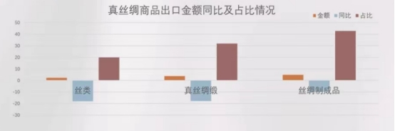1-12月,真絲綢商品出口額為11.63億美元,同比下降9.58%。其中,絲類出口2.32億美元,同比下降17.29%,占比19.97%;真絲綢緞出口3.72億美元,同比下降17.87%,占比32.02%;絲綢制成品出口4.99億美元,同比下降9.98%,占比42.89%。