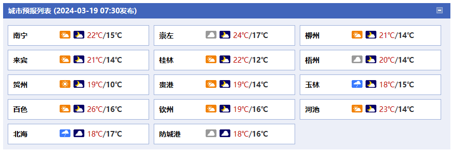 21日白天到晚上,桂東多云轉陰天有小雨,桂西多云到晴。