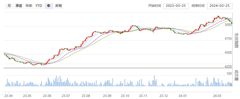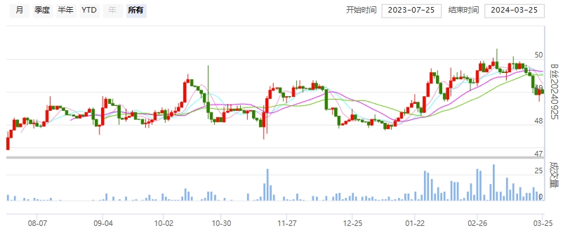今日(2024年03月25日,周一)中國繭絲綢交易市場生絲指數(shù)下跌0.63%收于5050.87點(diǎn)。B絲(商檢4A級生絲):240325合約下跌0.69萬元報(bào)收于51.84萬元;240925合約下跌0.12萬元報(bào)收于48.96萬元;250325合約報(bào)平收于49.29萬元。