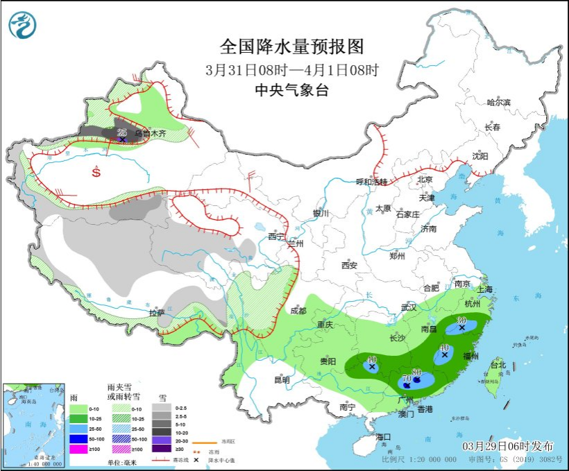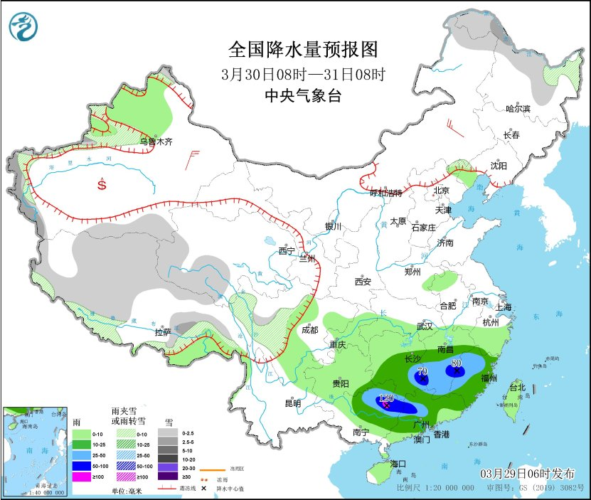 3月30日08時至31日08時,黑龍江北部、新疆南疆高海拔山區(qū)、西藏大部、青海西部、川西高原南部等地部分地區(qū)有小到中雪或雨夾雪。湖南中南部、江南中南部、福建大部、廣西西北部、廣東大部等地部分地區(qū)有中到大雨,其中,湖南東南部、江西西南部和東部、福建西部、廣西東北部、廣東西部等地部分地區(qū)有暴雨或大暴雨(100~120毫米)。內蒙古東南部、新疆東部等地部分地區(qū)有4~5級風(見圖3)。