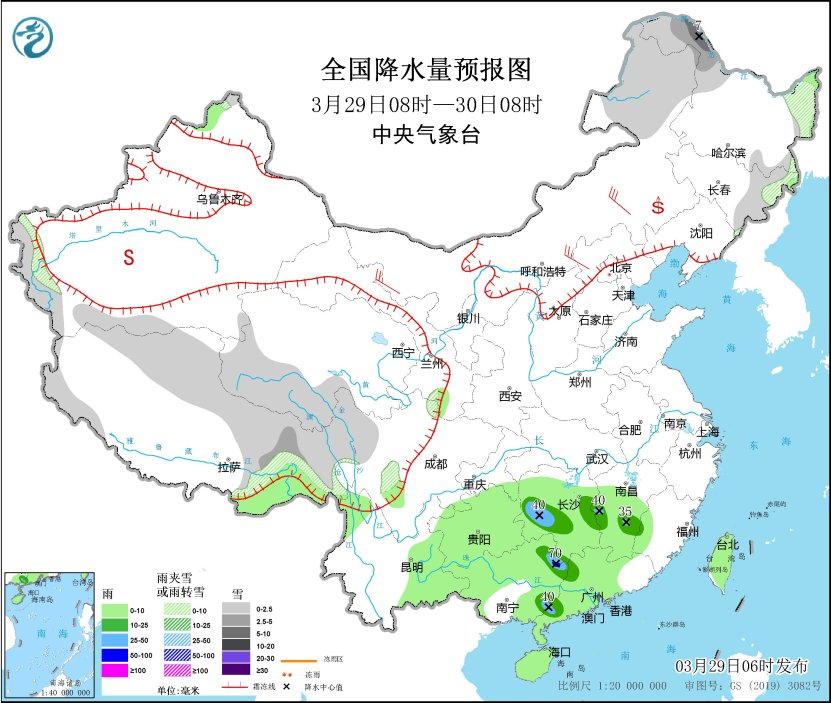 3月29日08時至30日08時,內蒙古東北部、黑龍江西北部和東部、吉林東部、西藏東部、青海西部等地部分地區(qū)有小到中雪或雨夾雪,其中,黑龍江西北部部分地區(qū)有大雪(5~7毫米)。湖南西部和東部、江西中南部、廣西東部、廣東中西部等地部分地區(qū)有中到大雨,其中,廣西東北部部分地區(qū)有暴雨(50~70毫米)。內蒙古東南部和西北部、河北北部等地部分地區(qū)有4~6級風(見圖2)。
