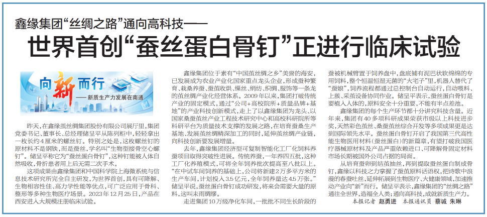從培育蠶卵到結(jié)繭抽絲,再到提取蠶絲蛋白制成骨釘,鑫緣以科技之力掌握了蠶繭原料話語權(quán),把詩歌中浪漫的春蠶吐絲,延伸拓展到生物醫(yī)療、大健康領(lǐng)域,加速推動(dòng)產(chǎn)業(yè)向“新”而行。儲(chǔ)呈平表示,鑫緣集團(tuán)的“絲綢之路”通往全世界,造福全人類;通向高科技,成就新質(zhì)生產(chǎn)力。
