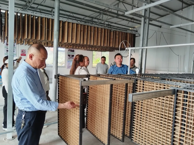 4月1日下午,貴州省農(nóng)科院蠶業(yè)所余文中主任5人及鳳岡縣金衣玉絲蠶桑種植專業(yè)合作社5人蒞臨林勝堂學(xué)習(xí)先進(jìn)技術(shù)及裝備。公司負(fù)責(zé)人黃副總陪同考察團(tuán)參觀了林勝堂省力化蠶具設(shè)備,并做了簡(jiǎn)要介紹。