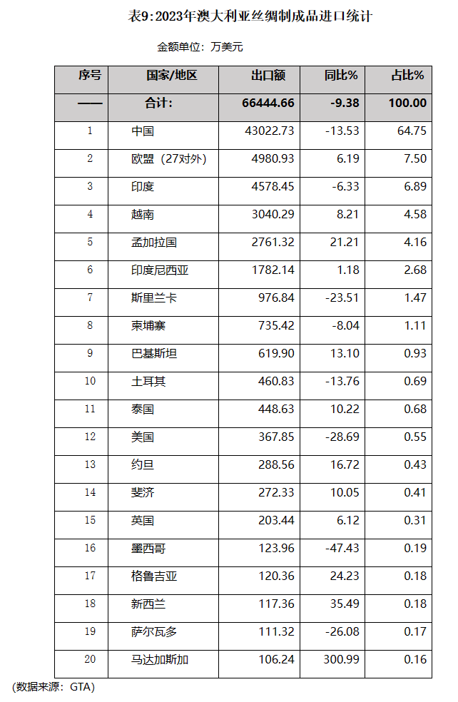 2021-2022年澳大利亞絲綢制成品進(jìn)口的快速增長(zhǎng)勢(shì)頭在2023年出現(xiàn)轉(zhuǎn)折,全年進(jìn)口額同比下降9.38%。自中國(guó)的進(jìn)口比重雖逐年下降,但仍占澳全部進(jìn)口的六成以上,遠(yuǎn)超其他進(jìn)口來(lái)源地。其他主要進(jìn)口來(lái)源中,自越南和孟加拉國(guó)的進(jìn)口保持較快增長(zhǎng)。(詳見(jiàn)表9)