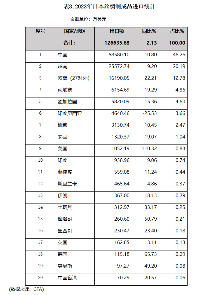 2023年日本絲綢制成品進(jìn)口小幅下降,主要進(jìn)口來(lái)源漲跌互現(xiàn)。中國(guó)作為日本絲綢制成品第一大進(jìn)口來(lái)源地雖進(jìn)口下降較多但其占比仍遙遙領(lǐng)先。自排名第2、3、4位的越南、歐盟和柬埔寨進(jìn)口均出現(xiàn)較大幅度增長(zhǎng)。(詳見(jiàn)表8)