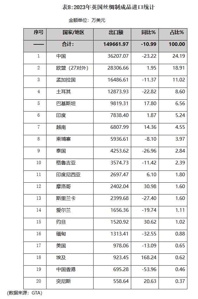 2023年英國(guó)絲綢制成品進(jìn)口由前兩年的快速增長(zhǎng)轉(zhuǎn)為下降。中國(guó)仍是其第一大進(jìn)口來(lái)源地,但進(jìn)口額同比降幅在主要來(lái)源中最高,達(dá)23.22%,所占份額有所下降。同樣降幅較大的還有土耳其和泰國(guó)。主要進(jìn)口來(lái)源中,自巴基斯坦和越南的進(jìn)口增幅最高。(詳見(jiàn)表8)