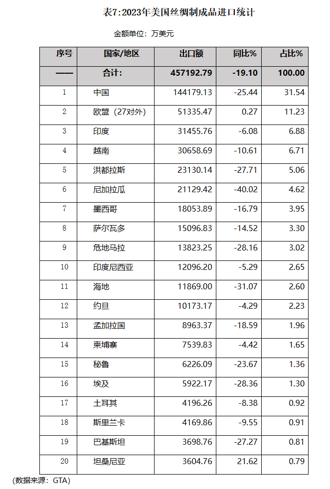 美國(guó)2023年絲綢制成品進(jìn)口出現(xiàn)較大幅度下降,主要進(jìn)口來(lái)源中,除自歐盟地區(qū)的進(jìn)口出現(xiàn)微幅增長(zhǎng)外,自其它主要來(lái)源進(jìn)口均出現(xiàn)不同幅度下降。其中自第一大進(jìn)口來(lái)源中國(guó)的進(jìn)口降幅達(dá)25.44%,其所占份額也有所減少。(詳見(jiàn)表7)