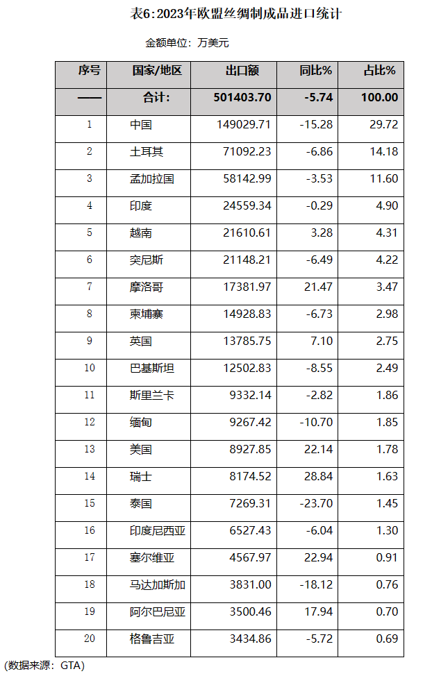2023年歐盟絲綢制成品進(jìn)口由升轉(zhuǎn)降,全年進(jìn)口同比下降5.74%。主要進(jìn)口來(lái)源中,中國(guó)穩(wěn)居歐盟絲綢制成品第一大進(jìn)口來(lái)源,占比較前兩年略有下降。自越南進(jìn)口近幾年保持持續(xù)增長(zhǎng),其進(jìn)口占比也穩(wěn)步提升,2023年已居第5位。(詳見(jiàn)表6)
