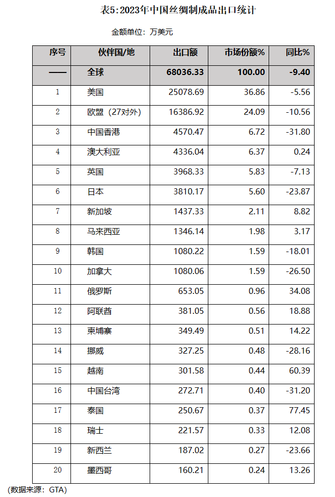2023年中國(guó)絲綢制成品對(duì)傳統(tǒng)主要市場(chǎng)出口全面下降,對(duì)新興市場(chǎng)出口則有升有降。其中,對(duì)中國(guó)香港、日本和加拿大的出口降幅均超過(guò)了20%。如需更多中國(guó)絲綢貿(mào)易情況,請(qǐng)登陸紡織商會(huì)網(wǎng)站(www.ccct.org.cn)至絲綢分會(huì)欄目查詢。(詳見(jiàn)表5)