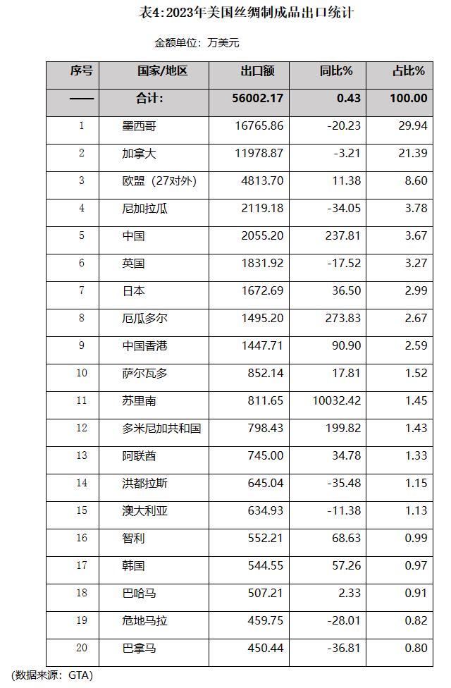 美國(guó)近五年絲綢制成品出口一直呈現(xiàn)增長(zhǎng)態(tài)勢(shì),2023年雖增速明顯放緩,但全年出口仍保持小幅增長(zhǎng)。墨西哥和加拿大是美最主要出口市場(chǎng),合計(jì)占比超五成,2023年對(duì)墨西哥的制成品出口出現(xiàn)較大下降,降幅達(dá)20.23%。2023年美國(guó)對(duì)中國(guó)絲綢制成品出口出現(xiàn)激增,中國(guó)的排位從2022年的第12位躍升至第5位,同樣出現(xiàn)出口激增的還有厄瓜多爾、蘇里南和多米尼加。(詳見(jiàn)表4)