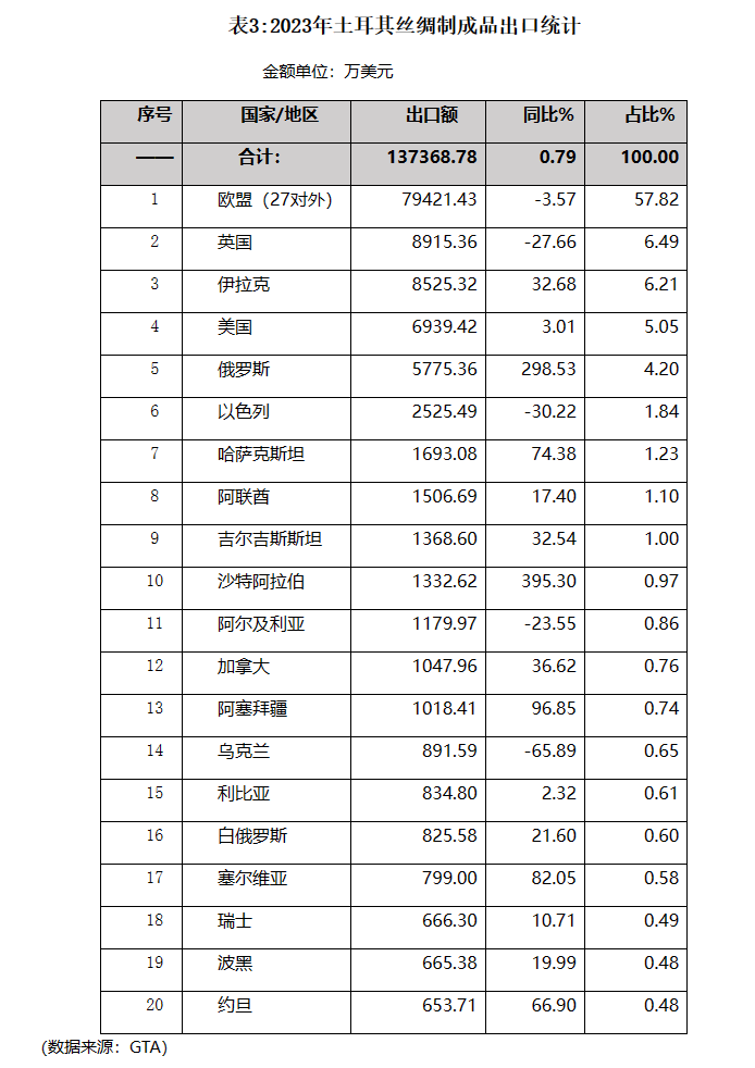 絲綢制成品出口額全球排名第三的土耳其2023年出口13.74億美元,同比增長(zhǎng)0.79%。歐盟是土耳其最主要的出口市場(chǎng),占比近六成,2023年土對(duì)歐盟的制成品出口未能延續(xù)前兩年的增長(zhǎng)趨勢(shì),出現(xiàn)小幅下降。