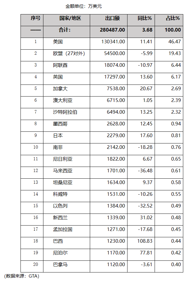 值得關(guān)注的是2023年土耳其對(duì)俄羅斯和沙特阿拉伯的出口出現(xiàn)激增,增幅分別達(dá)298.53%和395.30%,俄羅斯排位躍升至第五。(詳見(jiàn)表3)