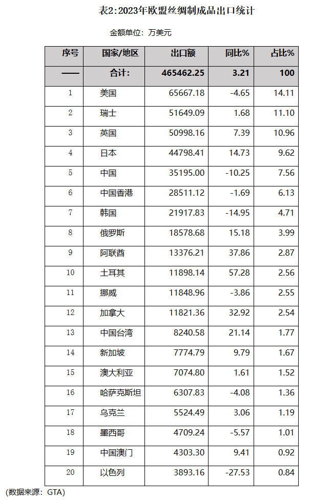 2023年歐盟絲綢制成品出口延續(xù)了2022年的增長(zhǎng)態(tài)勢(shì),出口額為46.55億美元,同比增長(zhǎng)3.21%,列全球首位。