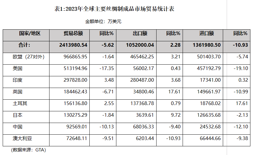 歐盟、美國(guó)、印度、土耳其、中國(guó)、日本、英國(guó)和澳大利亞是世界絲綢制成品貿(mào)易最重要的參與者,2023年7國(guó)和歐盟絲綢制成品貿(mào)易總額為241.40億美元,同比下降5.62%。其中出口額105.20億美元,同比增長(zhǎng)2.28%;進(jìn)口額136.20億美元,同比下降10.93%。(詳見(jiàn)表1)