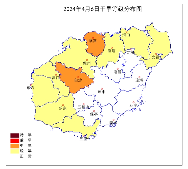 海南氣象干旱情況:截至4月6日,臨高和白沙為中度氣象干旱,澄邁、???、文昌、儋州、東方、三亞、昌江和樂東為輕度氣象干旱,其余市縣處于無氣象干旱狀態(tài)。與3月28日相比,樂東由中旱緩解為輕旱,五指山由中旱緩解為無旱,瓊中、屯昌由輕旱緩解為無旱,東方、儋州和文昌由無旱發(fā)展為輕旱。
