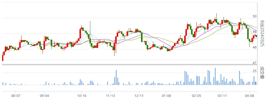 今日(2024年04月15日,周一)中國繭絲綢交易市場生絲指數(shù)持平收于4898.85點。B絲(商檢4A級生絲):240425合約報平收于48.72萬元;240925合約下跌0.12萬元報收于48.78萬元;250325合約下跌0.12萬元報收于49.44萬元。