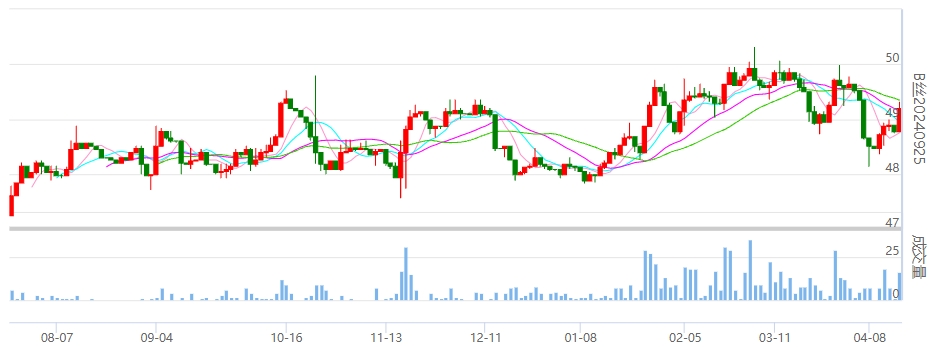 今日(2024年04月16日,周二)中國(guó)繭絲綢交易市場(chǎng)生絲指數(shù)上漲0.07%收于4902.10點(diǎn)。B絲(商檢4A級(jí)生絲):240425合約報(bào)平收于48.72萬(wàn)元;240925合約上漲0.42萬(wàn)元報(bào)收于49.20萬(wàn)元;250325合約上漲0.48萬(wàn)元報(bào)收于49.92萬(wàn)元。