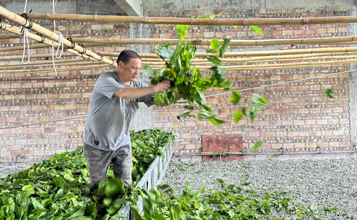 在黃海燕家二樓,她的丈夫羅超鵬正站在滑軌上給蠶寶寶喂食。隨著機(jī)械滑軌的移動(dòng),新鮮桑葉很快就均勻地鋪滿蠶房,目前黃海燕家已養(yǎng)了4批蠶。