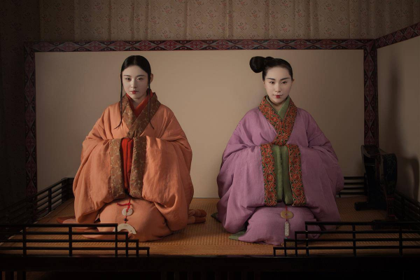 成立于2007年的裝束復原團隊,運用科學的研究及制作方法,已復原700余套先秦至清代的裝束和百余款發(fā)型、妝面,并在傳統(tǒng)文化可視化道路上不斷探索與實踐。配合這次“鳳凰故國——青銅時代曾楚藝術展”,該團隊根據(jù)馬山楚墓出土文物復原楚國貴族女子裝束。模特身著上下連屬式袍服,或梳歪髻,或編發(fā)垂髻,手持參考山字紋銅鏡等楚墓出土實物制作的道具,顯得雍容典雅,顧盼生輝。