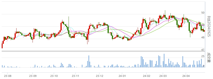 今日(2024年04月25日,周四)中國(guó)繭絲綢交易市場(chǎng)生絲指數(shù)微跌0.08%報(bào)于4865.99點(diǎn)。B絲(商檢4A級(jí)生絲):240525合約下跌0.06萬(wàn)元報(bào)收于48.45萬(wàn)元;240925合約上漲0.09萬(wàn)元報(bào)收于48.69萬(wàn)元;250325合約下跌0.09萬(wàn)元報(bào)收于48.84萬(wàn)元。