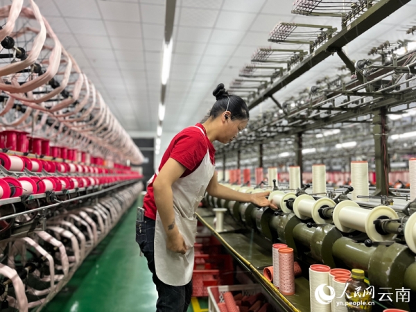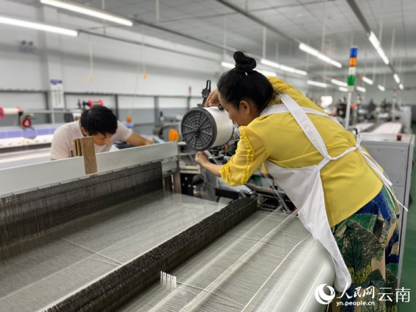 工人在云南七彩絲綢有限公司的車間里忙碌