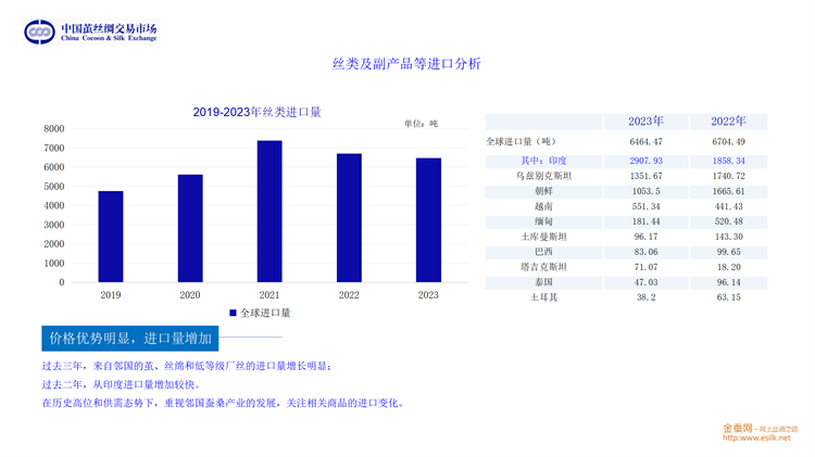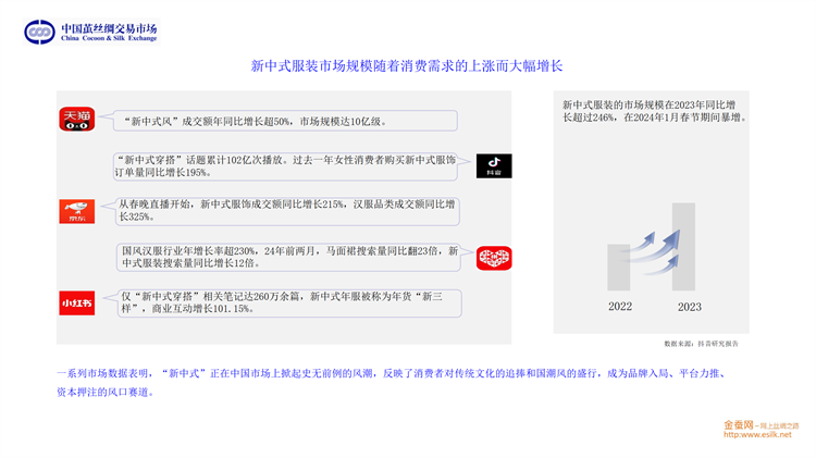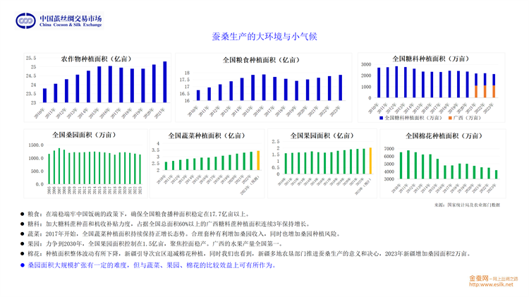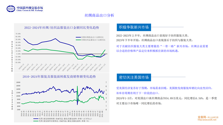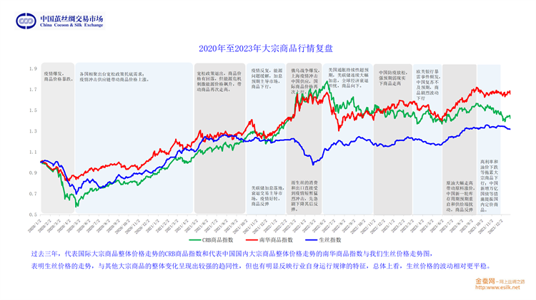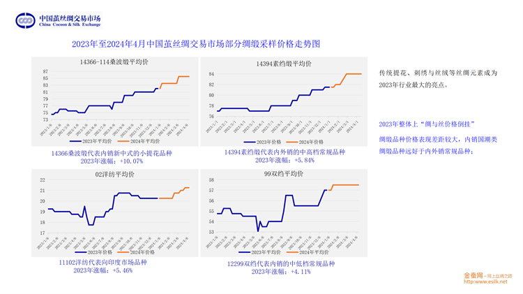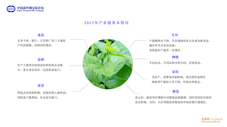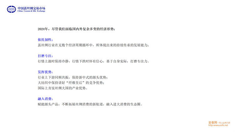 他從桑苗、蠶種、蠶繭、生絲、綢緞、家紡和服裝等多方面介紹了2023年產(chǎn)業(yè)鏈的基本情況;從生絲電子指數(shù)、高品質(zhì)生絲指數(shù)、蠶繭指數(shù)、綢緞指數(shù)等維度分析了供應(yīng)鏈的運轉(zhuǎn)態(tài)勢;并將繭絲品種置于國際大宗商品和紡織原料中進行分析。對于2024年的趨勢展望,劉董又從行業(yè)最源頭至內(nèi)外銷以及出口和進口市場等方面進行重點分析。