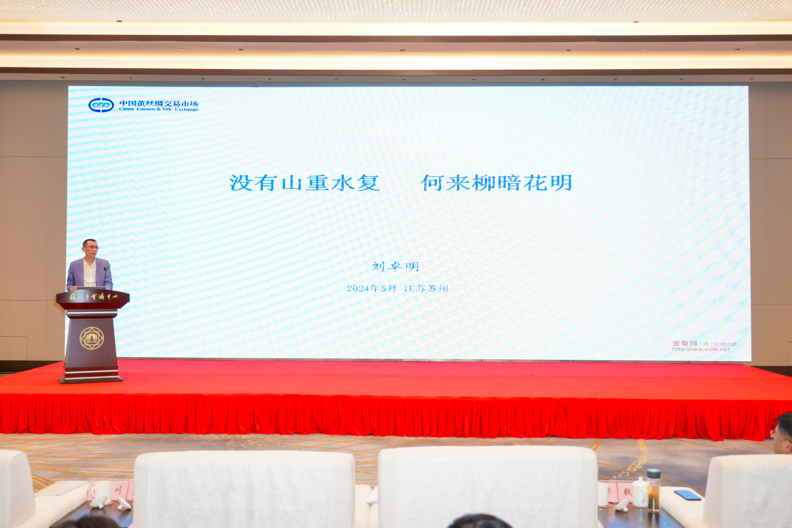 中國繭絲綢交易市場董事長劉卓明在2024全國繭絲綢產(chǎn)銷形勢分析會上作《沒有山重水復(fù) 何來柳暗花明》主題報告