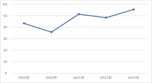 圖 1 2019-2023 年全國桑蠶繭收購均價走勢圖(價格:元/公斤)