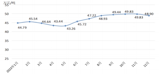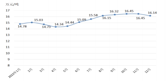 2023 年以來, 隨著國內(nèi)經(jīng)濟社會全面恢復(fù)常態(tài)化運行, 國民經(jīng)濟 運行延續(xù)恢復(fù)向好態(tài)勢, 特別是國家擴內(nèi)需促消費系列政策紅利的持 續(xù)釋放, 絲綢消費市場需求得到有效激活, 拉動了繭絲價格的不斷攀 升。 11 月中旬, 為穩(wěn)定繭絲綢行業(yè)發(fā)展, 維護蠶農(nóng)利益, 促進產(chǎn)銷平 衡,國家繭絲綢協(xié)調(diào)辦公室通過公開招標(biāo)方式開展了中央儲備生絲收 儲工作,計劃收儲 5A 級及以上生絲數(shù)量 500 噸,有效提振了市場信 心。截至 12 月底,國內(nèi)干繭和 4A 級生絲的價格分別為 16.14 萬元/ 噸、48.9 萬元/噸, 同比分別增長 12.61%和 12.65%,均創(chuàng)近五年來價格新高。見圖 6、圖 7。
