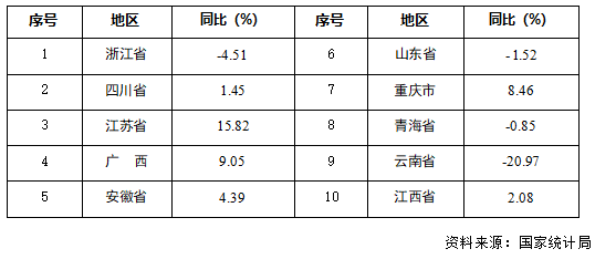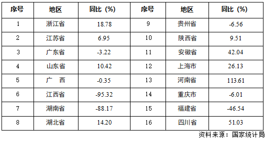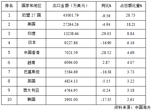 在出口金額前十位的?。▍^(qū))市中,排名前五位的浙江、江蘇、 廣東、上海、山東等東部沿海省市出口總金額超過 12.18 億美元, 占 總額比重的 81.21%,同比分別下降 16.53%、8.22%、13.29%、2.07%、 16.88%。而廣西、青海和云南等西部?。▍^(qū)) 和遼寧的出口則出現(xiàn)較 大幅度增長,同比分別增長 21.44%、13.89%、10.11%和 26.13%。各?。▍^(qū))市排名情況見表 8。