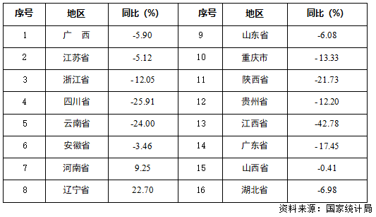 生絲產(chǎn)量排名前五位的?。▍^(qū)) 為廣西、江蘇、浙江、四川和云 南, 各?。▍^(qū)) 生絲產(chǎn)量同比均出現(xiàn)不同程度下降。其中, 廣西生絲 產(chǎn)量同比下降 5.9%,占全國總產(chǎn)量的 45.44%;江蘇和浙江生絲產(chǎn)量 全國占比分別為 15.13%和 11.78%,同比分別下降 5.12%和 12.05%;四川和云南生絲產(chǎn)量下降幅度較大, 同比分別下降 25.91%和 24.00%。