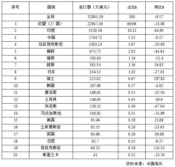 從主要進口市場情況看, 從印度、越南、瑞士、土耳其、美國、 英國、塔吉克斯坦進口金額增幅較大, 其中從印度進口金額 3320.56 萬美元, 同比增長 64.93%;從越南進口金額 381.54 萬美元, 同比增 長 26.85%;從瑞士進口金額 221.02 萬美元,同比增長 197.83%。詳見表 9。