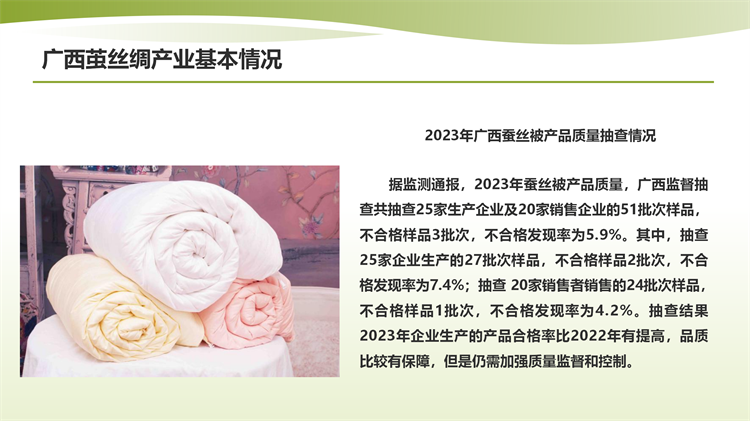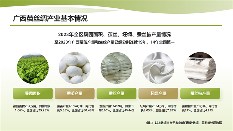 2023年,全區(qū)桑園面積287萬畝,同比增長1.06%,全國占比25.25%;蠶繭產(chǎn)量46.14萬噸,同比增長5.56%,全國占比60.48%;蠶絲產(chǎn)量17437噸,同比下降5.90%,全國占比45.44%;坯綢產(chǎn)量2024萬米,同比增長9.05%,全國占比7.89%;?蠶絲被產(chǎn)量31萬條,同比增長24%,全國占比4.23%。