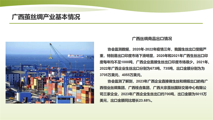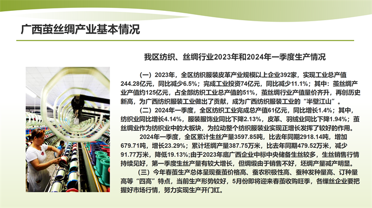 廣西繭絲綢行業(yè)協(xié)會會長賴以軍在2024全國繭絲綢產(chǎn)銷形勢分析會上介紹廣西行業(yè)發(fā)展情況