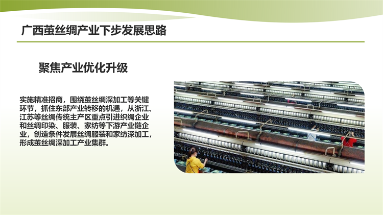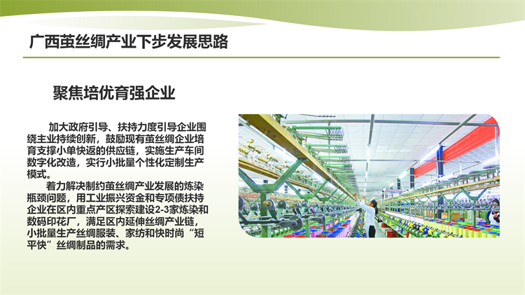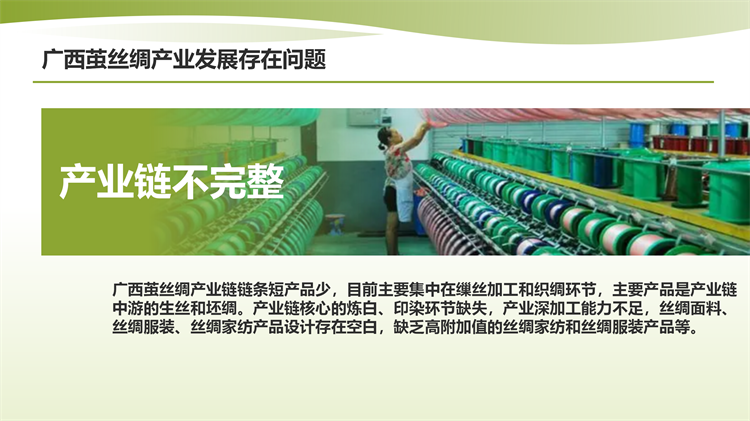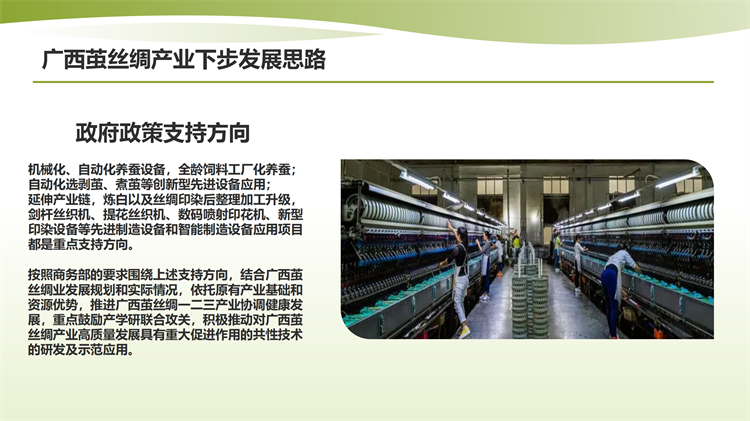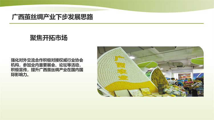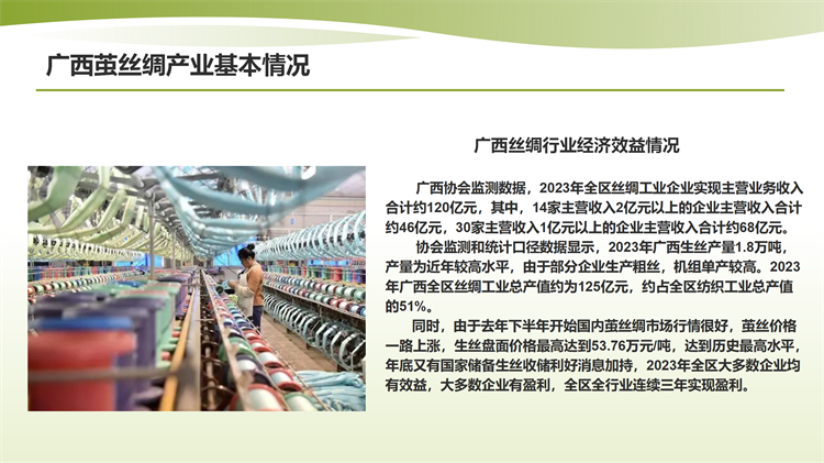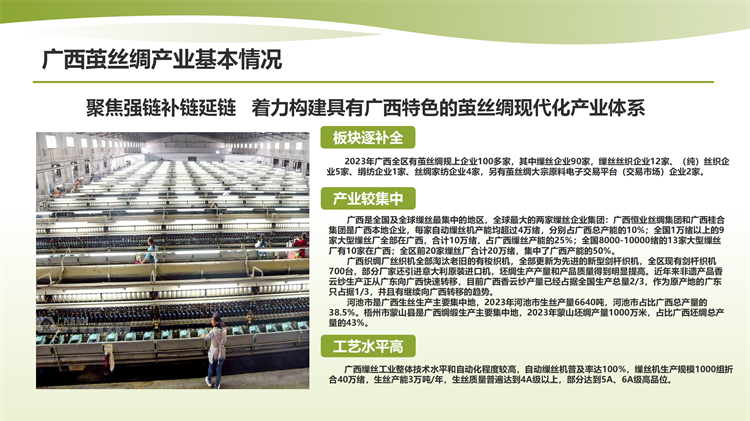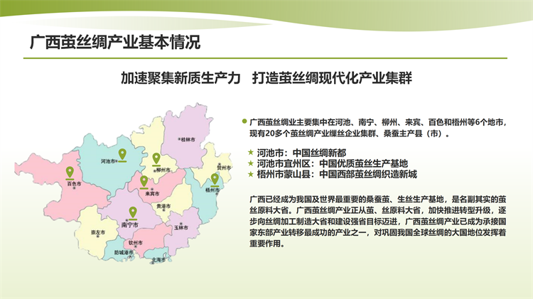 一、基本情況:廣西繭絲綢業(yè)主要集中在河池、南寧、柳州、來賓、百色和梧州等6個地市,現(xiàn)有20多個繭絲綢產(chǎn)業(yè)繅絲企業(yè)集群、桑蠶主產(chǎn)縣(市)。