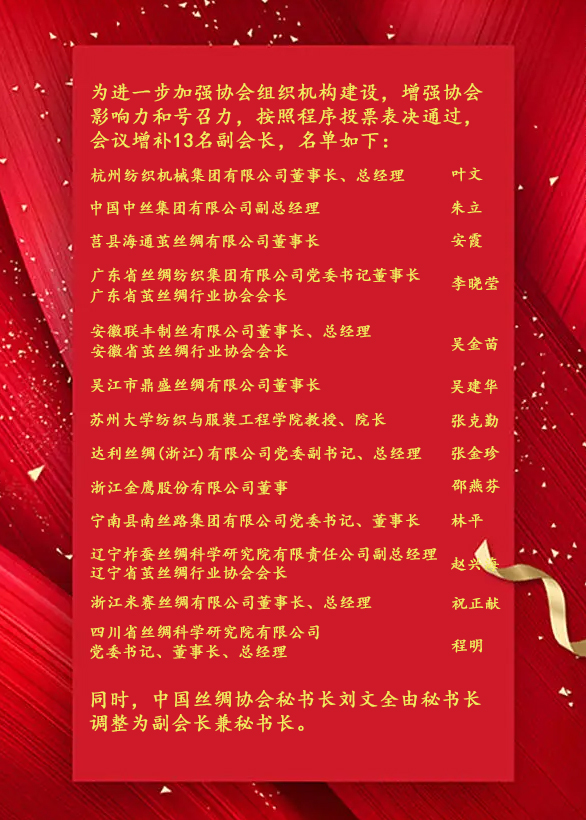 唐會長希望,通過本次會議大家能夠認(rèn)清形勢、統(tǒng)一共識、堅定信心、行穩(wěn)致遠(yuǎn),力爭為繼續(xù)推動經(jīng)濟回升向好,開創(chuàng)我國繭絲綢行業(yè)高質(zhì)量發(fā)展新局面,做出新的更大貢獻(xiàn)。