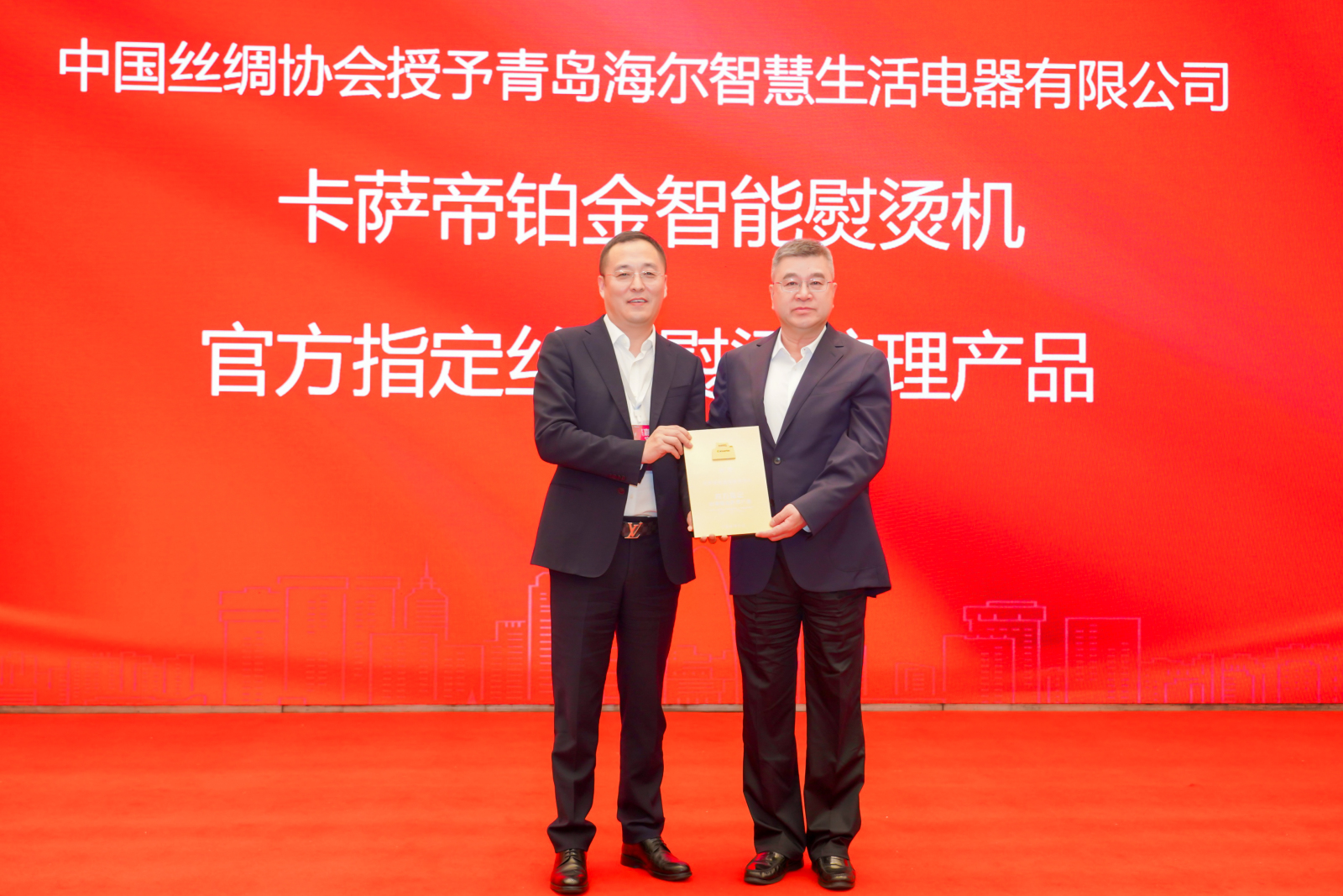 中國絲綢協(xié)會授予青島海爾智慧生活電器有限公司卡薩帝鉑金智能熨燙機為“官方指定絲綢熨燙護(hù)理產(chǎn)品”。