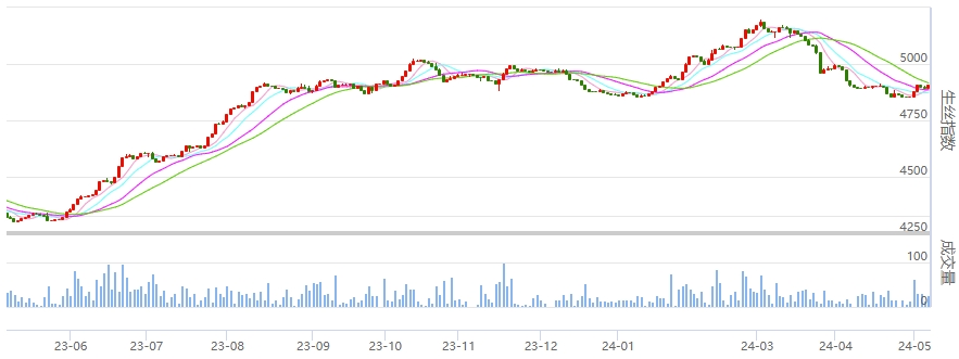 今日(周三)盤面各遠(yuǎn)近合約小幅收紅,現(xiàn)貨月240525生絲合約倉(cāng)量有增加,同時(shí)主力240925和250325合約均成交較為活躍。作為聯(lián)系上下游、反映供需兩端的生絲價(jià)格在買賣雙方膜和博弈中產(chǎn)生成交。