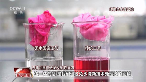 “大家可以看到的就是這個是我們傳統(tǒng)的,它跟纖維的結(jié)合能力比較差,所以它殘留了非常多的顏色。這一杯是我們通過免水洗新技術(shù)處理過的面料,你可以看到它的杯底,基本都是已經(jīng)沒有顏色的了,它是相當(dāng)于我們的活性染料和我們的面料纖維已經(jīng)達到了100%的結(jié)合。”許文強說。