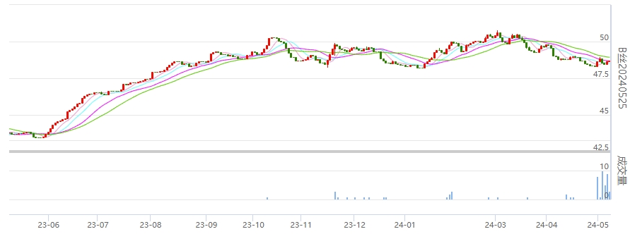 今日(2024年05月10日,周五)中國(guó)繭絲綢交易市場(chǎng)生絲指數(shù)微漲0.05%報(bào)于4912.13點(diǎn)。B絲(商檢4A級(jí)生絲):240525合約上漲0.06萬(wàn)元報(bào)收于48.72萬(wàn)元;240925合約上漲0.06萬(wàn)元報(bào)收于49.26萬(wàn)元;250325合約報(bào)平收于49.47萬(wàn)元。