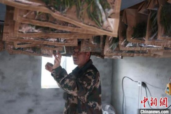 關(guān)偉在蠶室里觀察著蠶寶的生長(zhǎng)情況