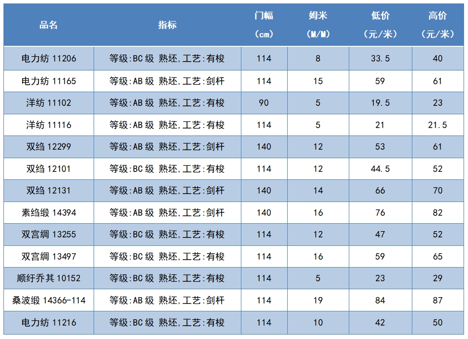 本周綢緞指數(shù)協(xié)作單位成交價(jià)格區(qū)間
