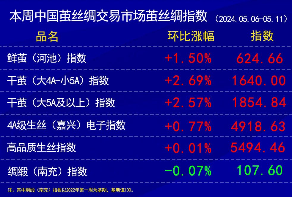 今日(周五)盤面小幅收紅,成交一般。整體上,五一假期后,春繭收購(gòu)態(tài)勢(shì)推動(dòng)下,4A級(jí)生絲電子指數(shù)有所上漲。本周六個(gè)交易日累計(jì)上漲0.77%報(bào)收于4918.63點(diǎn)。