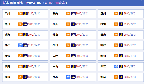 廣東大部今明天(5月14日至15日)以晴到多云為主,大家可以趁晴洗曬,不過雷州半島多降雨出沒,局地有大雨或暴雨,公眾雨天出行請留意交通安全。