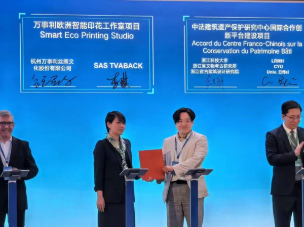 當?shù)貢r間5月13日下午,由浙江省政府主辦的浙江—法國高新產業(yè)創(chuàng)新合作對接會在法國巴黎舉行,杭州萬事利絲綢文化股份有限公司與法國企業(yè)SAS TVABACK就“萬事利歐洲智能印花工作室項目”(Smart Eco Printing Studio)達成合作。省委書記、省人大常委會主任易煉紅在會上致辭并見證一系列項目簽約。