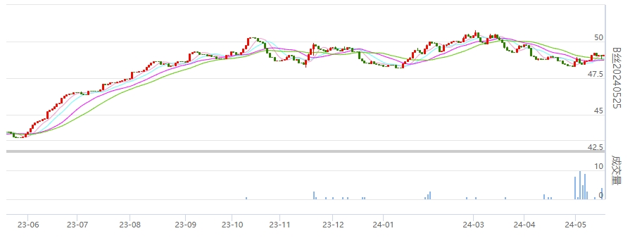 今日(2024年05月20日,周一)中國繭絲綢交易市場生絲指數(shù)微漲0.03%報于4951.84點。B絲(商檢4A級生絲):240525合約上漲0.03萬元報收于49.08萬元;240925合約上漲0.06萬元報收于49.56萬元;250325合約上漲0.03萬元報收于50.01萬元。