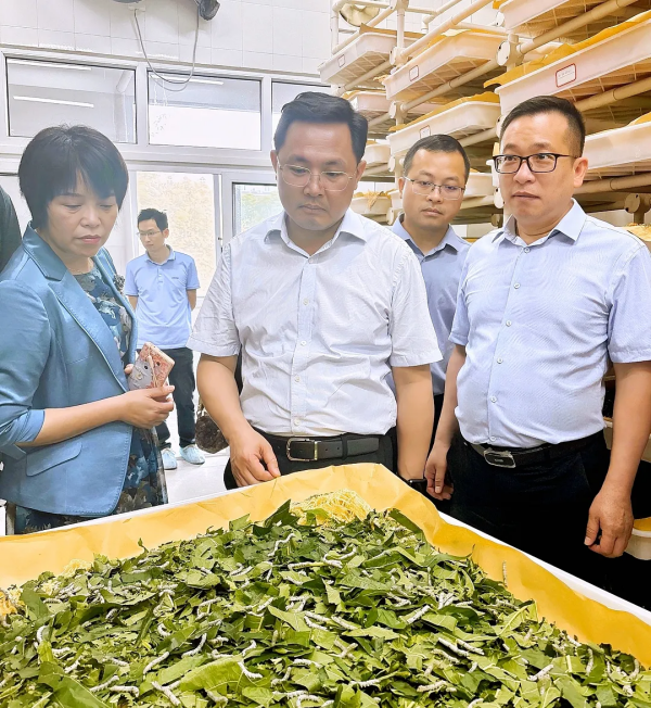在參觀西南大學(xué)家蠶基因組生物學(xué)國家重點(diǎn)實(shí)驗(yàn)室時(shí),考察組與國家桑蠶產(chǎn)業(yè)技術(shù)體系前任首席科學(xué)家魯成教授、現(xiàn)任首席科學(xué)家代方銀教授和首席辦陳鵬副教授進(jìn)行了座談交流。該實(shí)驗(yàn)室以家蠶基因組生物學(xué)系統(tǒng)研究為核心,通過開展“家蠶基因組和功能基因組學(xué)”“蠶桑資源與實(shí)驗(yàn)生物系統(tǒng)”“生物技術(shù)與遺傳改良”三個(gè)方向的研究,擁有世界最大的家蠶遺傳資源庫、多樣性最豐富的桑樹種子質(zhì)量資源圃。薛海源表示,宜州桑蠶繭絲綢資源豐富,希望能夠進(jìn)一步加強(qiáng)校地合作,構(gòu)建全域桑蠶繭絲綢科技大聯(lián)合、大協(xié)作、大推廣的新機(jī)制,形成整體合力,走好“振興絲綢新長征”,共同建設(shè)“中國絲綢新都”。