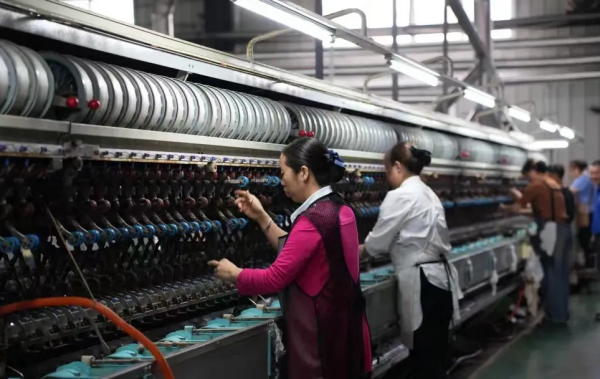 新絲路公司的生產(chǎn)車間里,機器轟鳴,12組自動繅絲生產(chǎn)線飛速運轉。工人們選繭、繅絲、捆絲一派繁忙。不久后,這批高質量繭絲將通過上海港出口,運往羅馬尼亞、意大利等地。